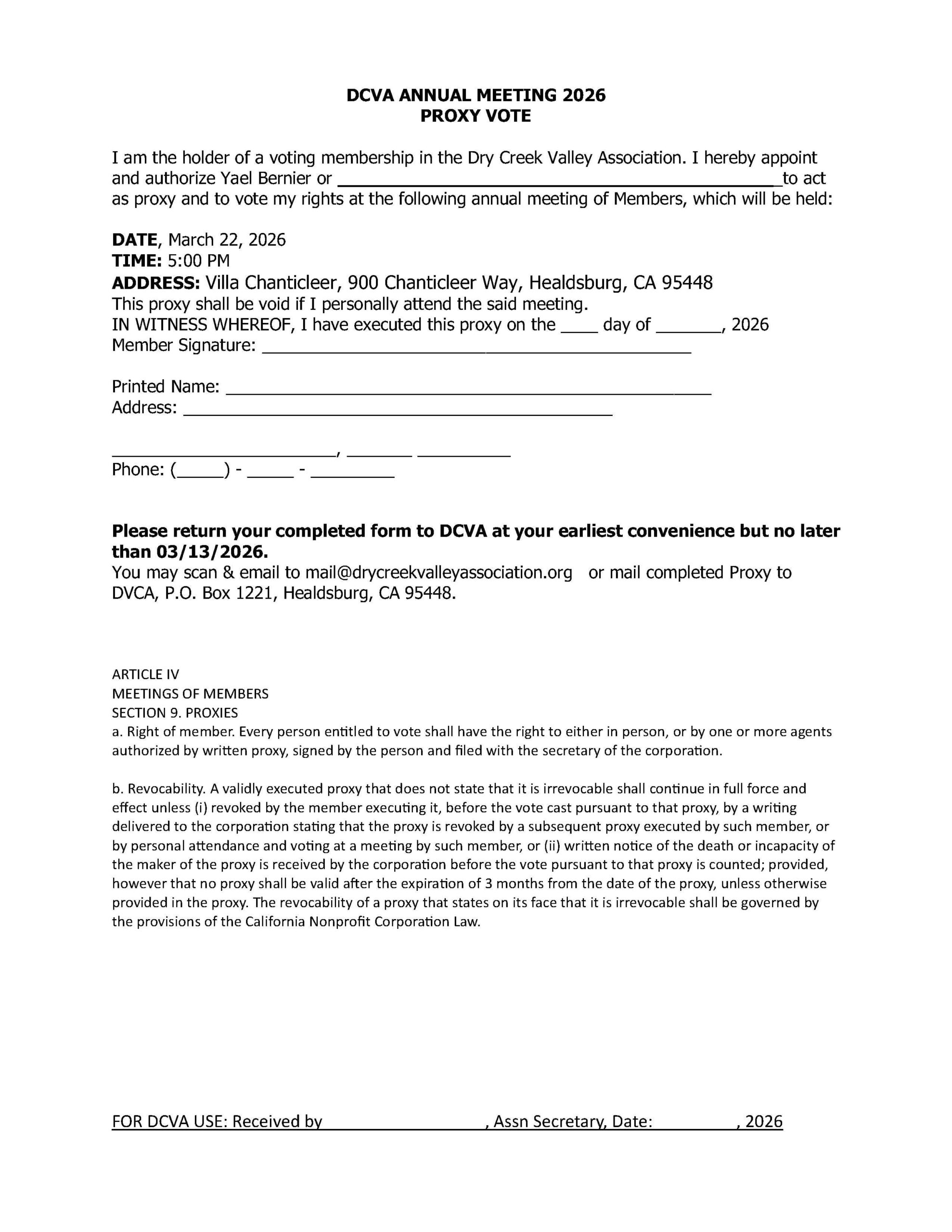 Please use the attached proxy vote document if you can’t attend, but would like to have your vote counted in the election of DCVA Board Members.”